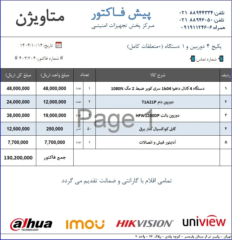 با توجه به نوسانات بازار ممکن است قیمت پیش فاکتور نیاز به تغییراتی جزئی باشد؛ جهت کسب اطلاعات بیشتر در تماس باشید.