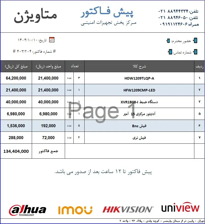 با توجه به نوسانات بازار ممکن است قیمت پیش فاکتور نیاز به تغییراتی جزئی باشد؛ جهت کسب اطلاعات بیشتر در تماس باشید.